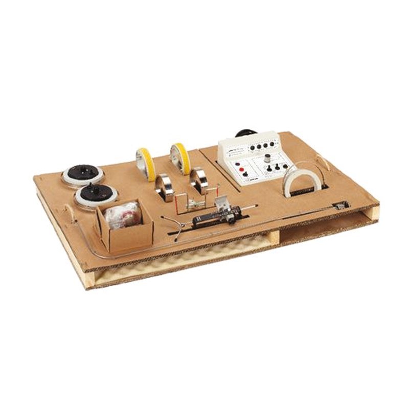 Points forts de ce Kit : Possibilité de faire varier un seul paramètre à la fois (masse, longueur du pendule ou amortissement) Longueur, masse et amortissement variables Fixation simple des différents éléments Frottements faibles Composition : – Support pendule simple : fourche de fixation pour poulie étagée, fil de 1 mètre, clip de fixation des masses réglable en hauteur. – Support pendule pesant : fourche de fixation sur poulie étagée, tige rigide graduée L = 600 mm. – 2 masses 100 et 150 g avec système d’accroche pour clip et tige graduée. – Disque amortisseur avec système d’accroche sur masse. – Palette pour étude des régimes apériodiques et critiques, se fixe à l’extrémité de la tige graduée. – Une poulie étagée avec roulement à billes de haute qualité