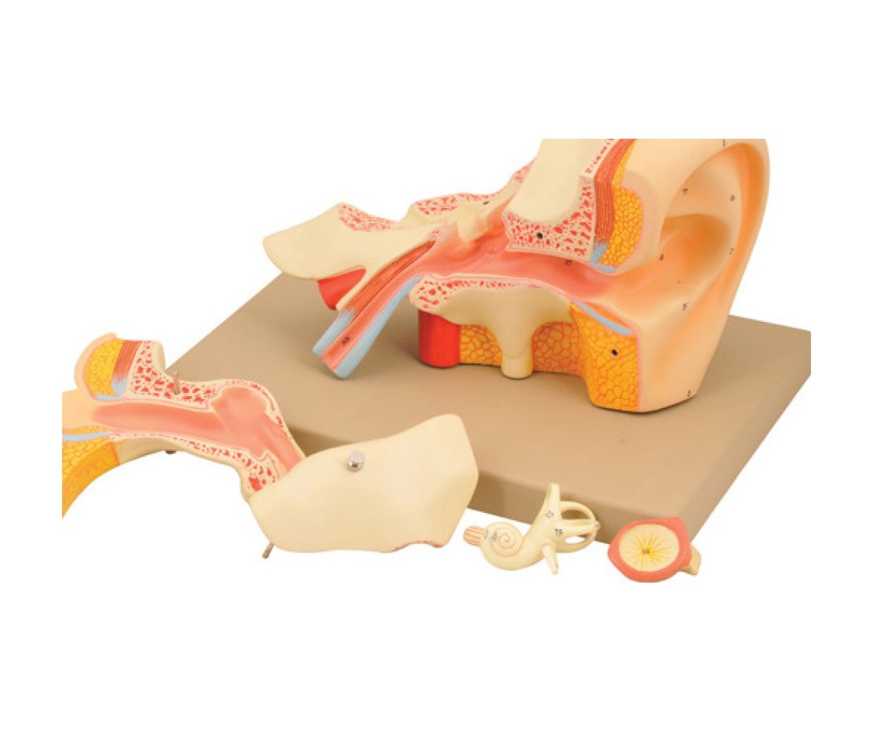 Démontable en 5 parties : pavillon ,partie osseuse, tympan, osselets, labyrinthe 33 x 23 x 20 cm ; sur support