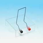 L’expérience d’Oersted consiste à positionner le support pour que le fil rigide soit dans l’axe de l’aiguille. Lorsqu’on fait passer un courant dans ce fil, l’aiguille aimantée dévie.