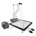 – Un plateau sérigraphié de dimensions 220x200mm environ avec trou central et équipé de 2 poulies à roulement à billes et pouvant coulisser sur toute la largeur du plateau;